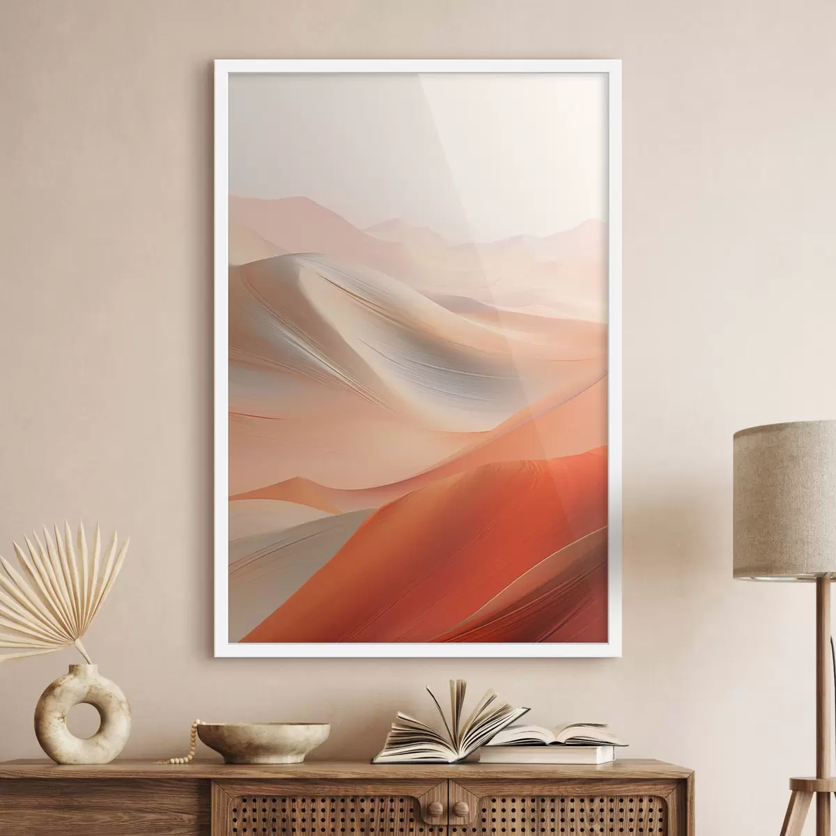 Plakatas Abstraktus dykumos peizažas su banguojančiomis smėlio kopomis šiltų oranžinių ir baltų atspalvių Ne f47030