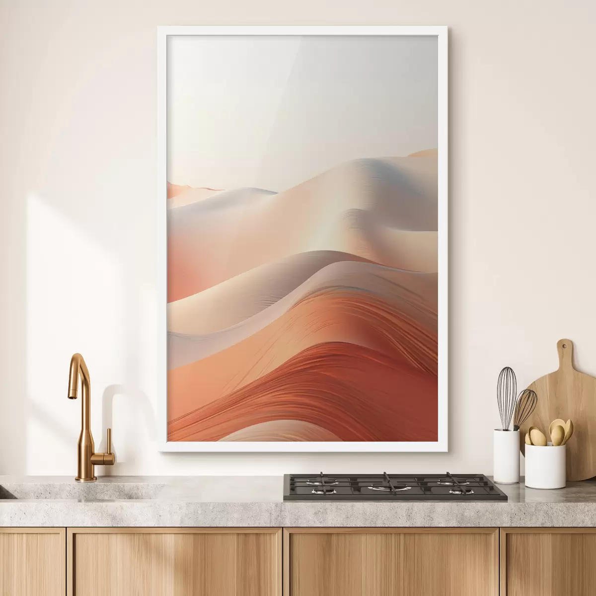 Plakatas Abstraktus dykumos peizažas su banguojančiomis smėlio kopomis šiltų oranžinių ir baltų atspalvių Ne f47031