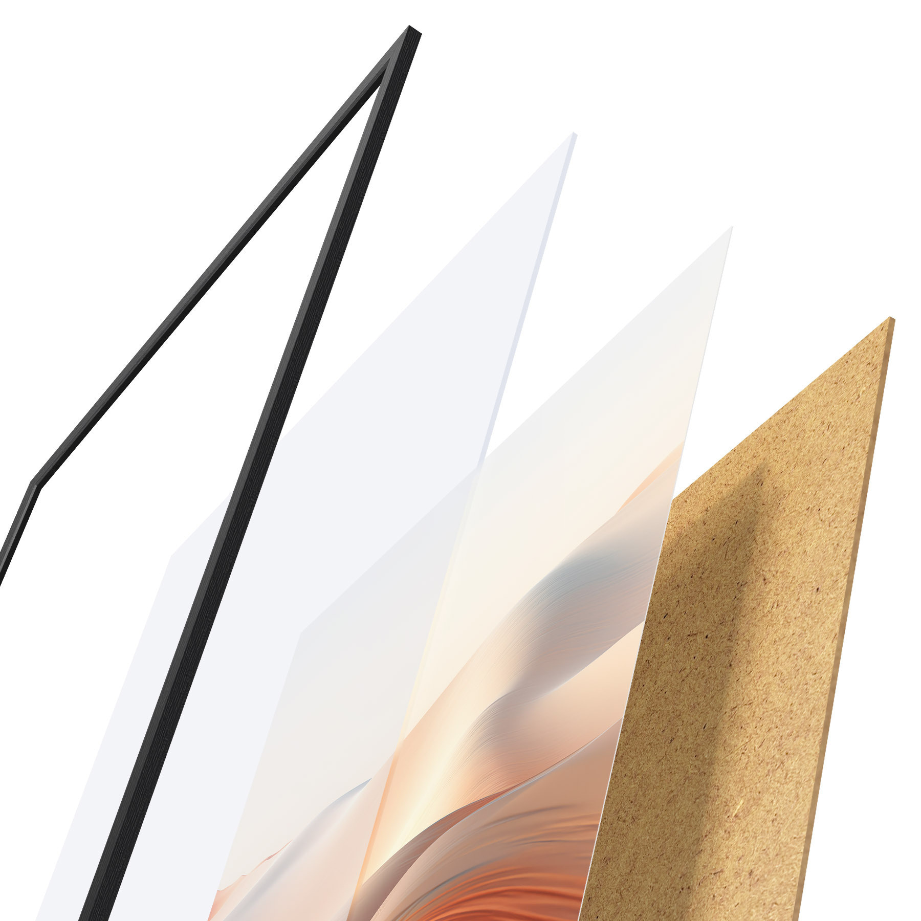Plakatą sudaro rėmas, pleksiklas, atspausdintas vaizdas ir medžio drožlių plokštės pagrindas. Plakatą galima iš karto pakabinti ant sienos dėl kitoje pusėje esančių laikiklių.