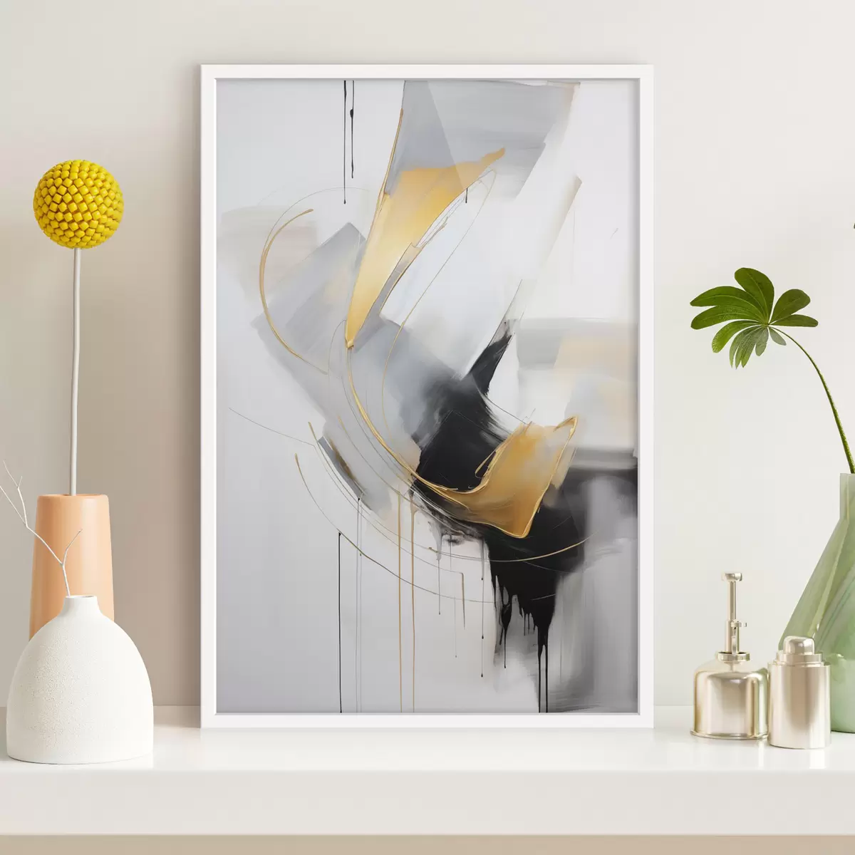 Plakatas Abstraktaus tapybos kūrinys su geltonos, juodos ir baltos spalvų potėpiais, dinamiškomis linijomis. f47034