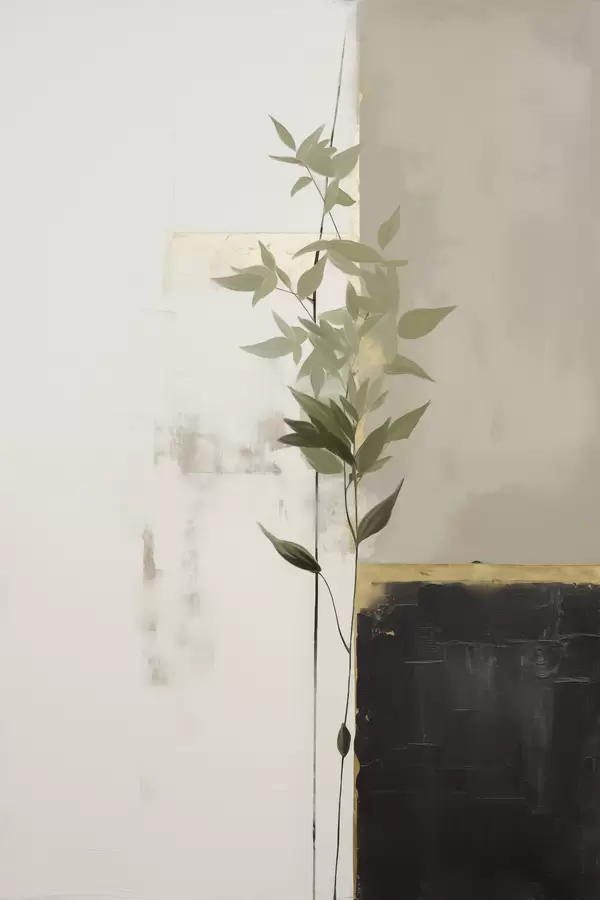 Plakatas Minimalistinis tekstūruotas paveikslas, vaizduojantis vazą su žaliais lapais abstrakčių geometrinių formų fone f47037