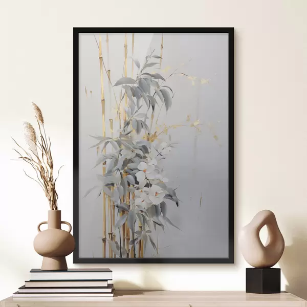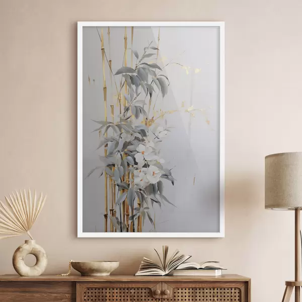 Plakatas Abstrakčios bambuko stiebai su geltonais akcentais, subtiliais baltais žiedais ir šviesiai žaliais lapais, pilkas fonas f47038