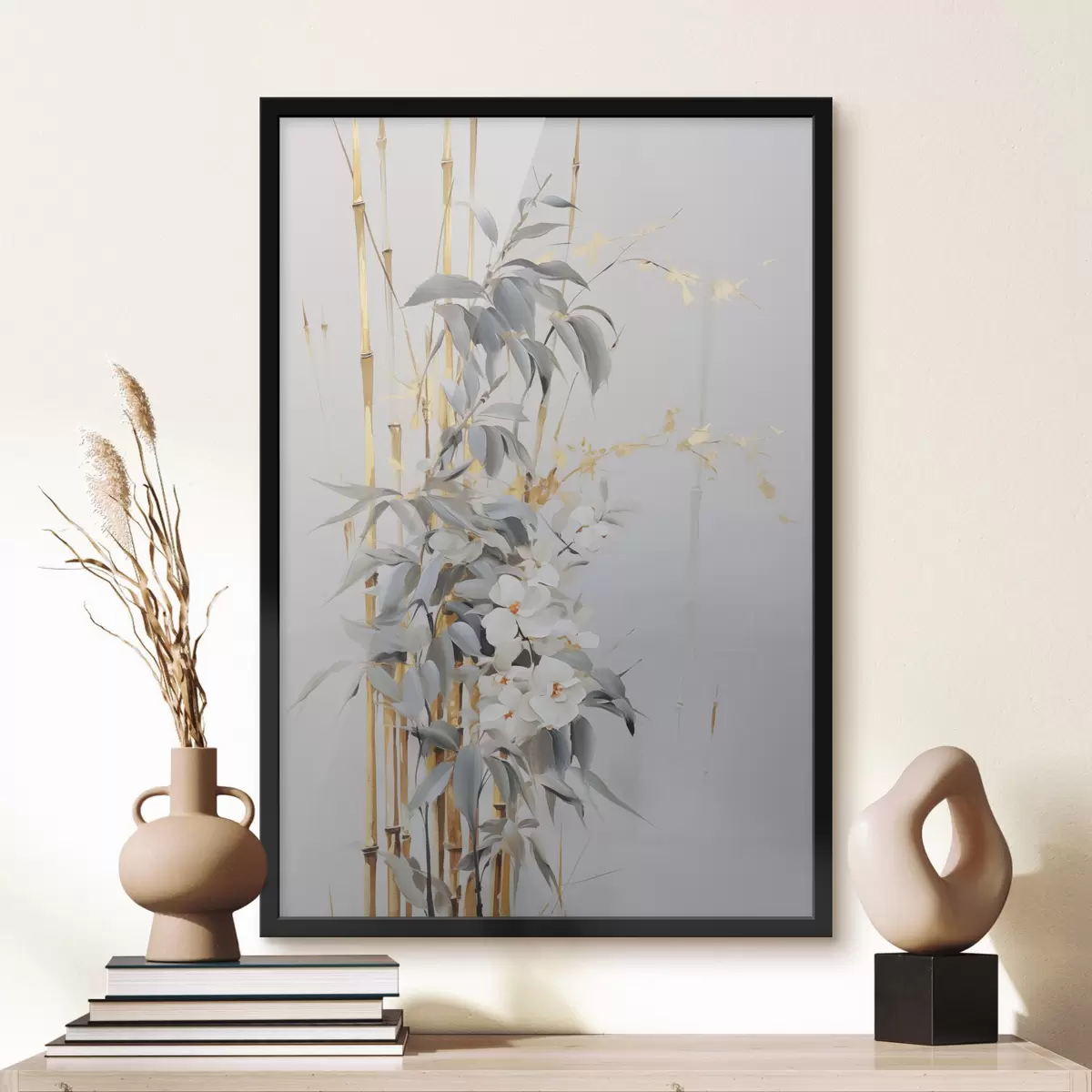 Plakatas Abstrakčios bambuko stiebai su geltonais akcentais, subtiliais baltais žiedais ir šviesiai žaliais lapais, pilkas fonas Ne f47038