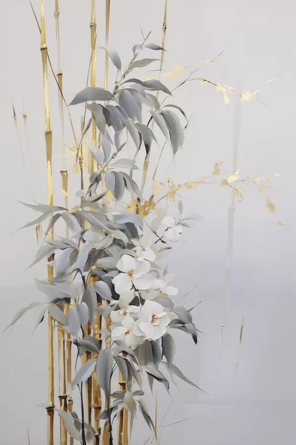 Plakatas Abstrakčios bambuko stiebai su geltonais akcentais, subtiliais baltais žiedais ir šviesiai žaliais lapais, pilkas fonas f47038