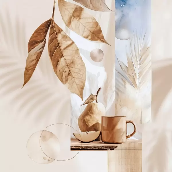 Plakatas Abstraktus su lapais, kriauše ir puodeliu Ne f47047
