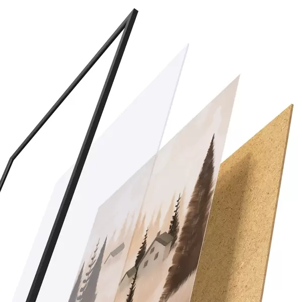 Plakatą sudaro rėmas, pleksiklas, atspausdintas vaizdas ir medžio drožlių plokštės pagrindas. Plakatą galima iš karto pakabinti ant sienos dėl kitoje pusėje esančių laikiklių.