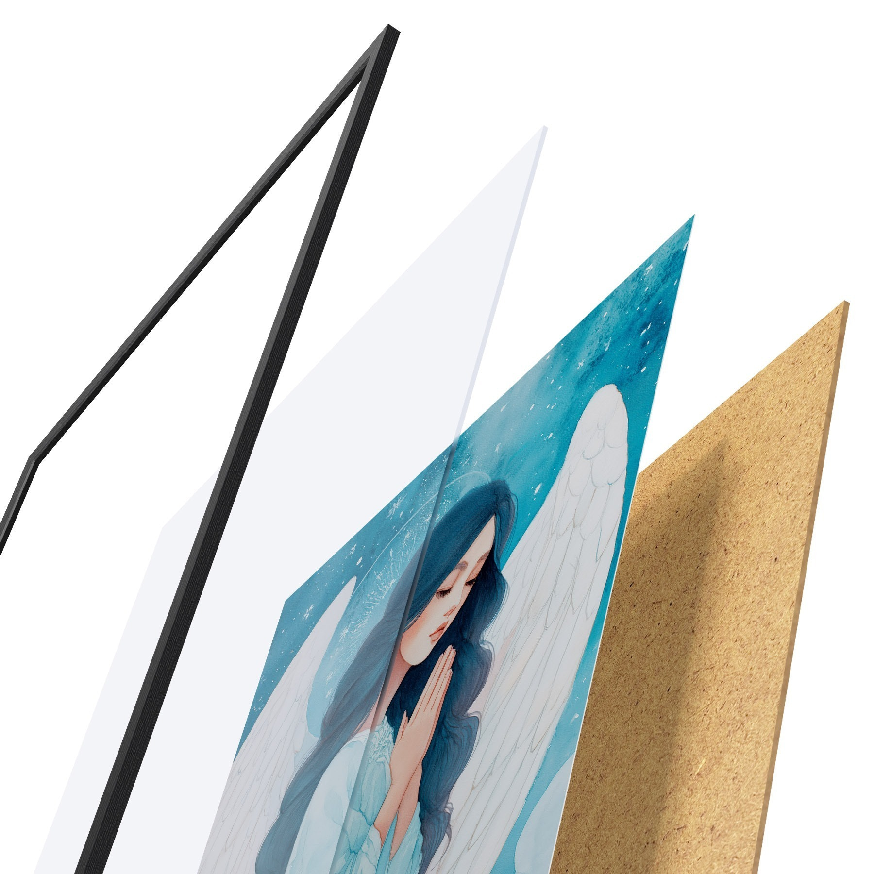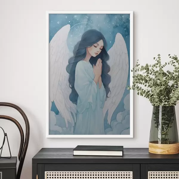 Plakatas Žavinga iliustracija, vaizduojanti angelą tarp debesų, balta ir mėlyna spalvų palete. Ne f47095