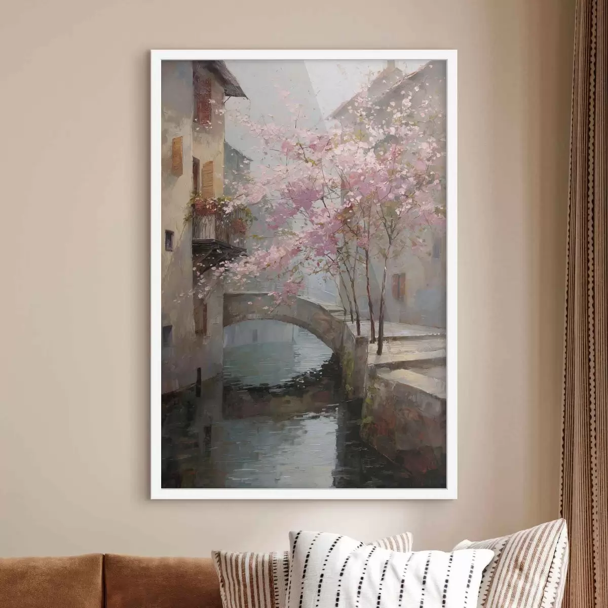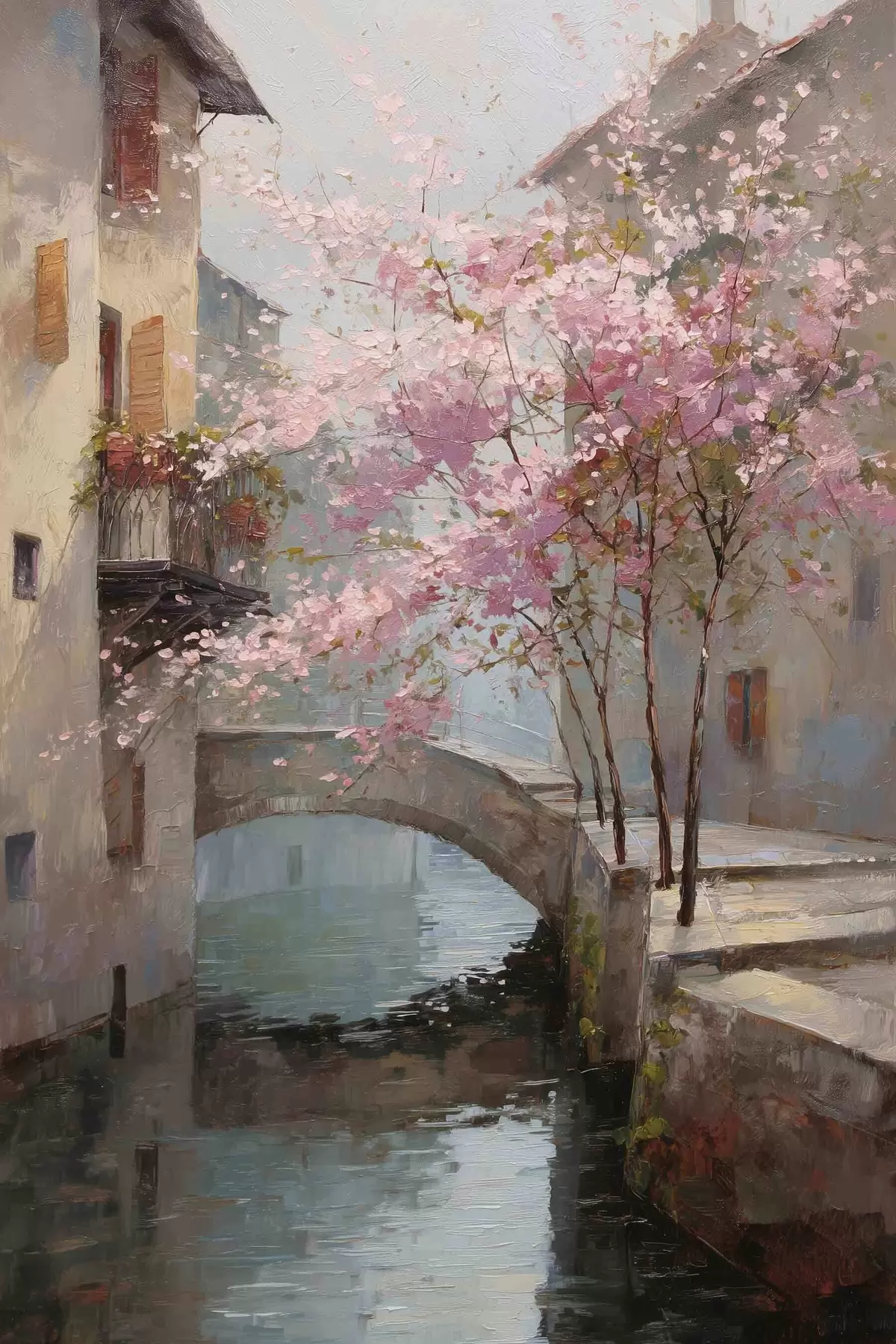 Plakatas romantiškas miesto peizažas su žydinčiu medžiu aliejaus tapybos stiliumi f47127