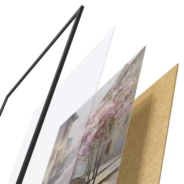 Plakatą sudaro rėmas, pleksiklas, atspausdintas vaizdas ir medžio drožlių plokštės pagrindas. Plakatą galima iš karto pakabinti ant sienos dėl kitoje pusėje esančių laikiklių.