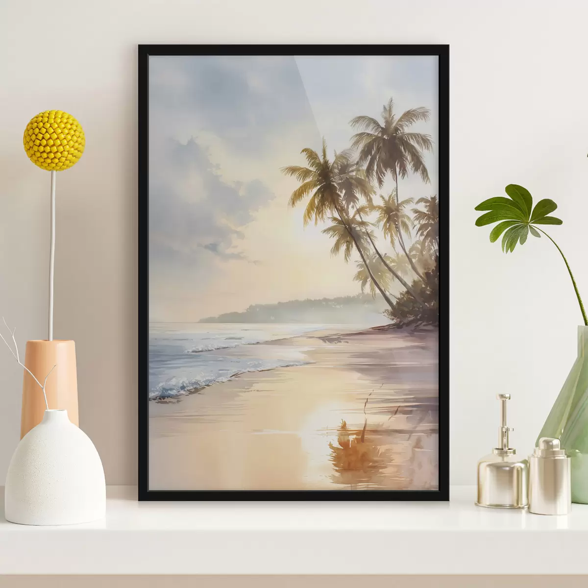 Plakatas akvarelės stiliaus saulėlydžio paplūdimys saloje f47135