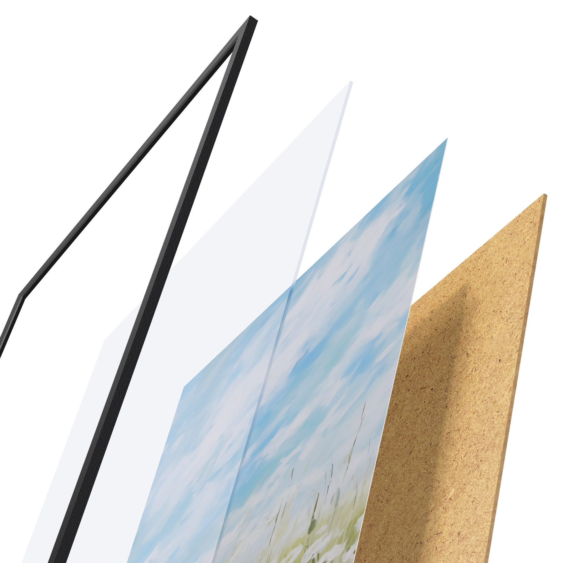 Plakatą sudaro rėmas, pleksiklas, atspausdintas vaizdas ir medžio drožlių plokštės pagrindas. Plakatą galima iš karto pakabinti ant sienos dėl kitoje pusėje esančių laikiklių.