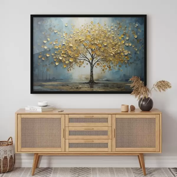 Plakatas Medis su geltonais lapais prieš mėlyną foną f47256