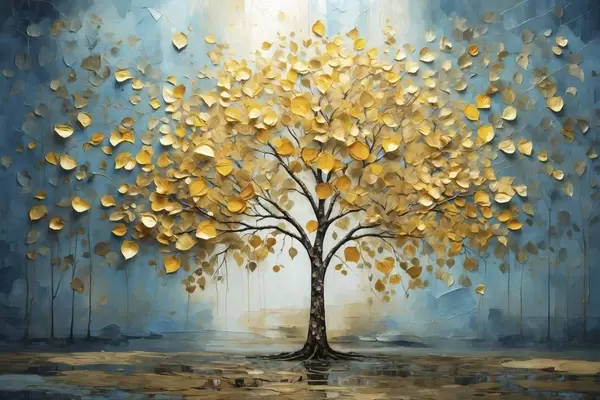 Plakatas Medis su geltonais lapais prieš mėlyną foną Ne f47256