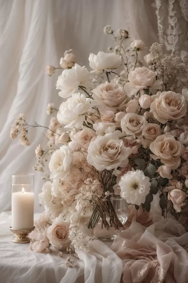 Plakatas Kreminės gėlės šalia uždegtos žvakės f47281