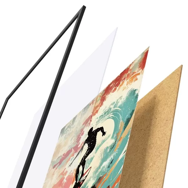 Plakatą sudaro rėmas, pleksiklas, atspausdintas vaizdas ir medžio drožlių plokštės pagrindas. Plakatą galima iš karto pakabinti ant sienos dėl kitoje pusėje esančių laikiklių.