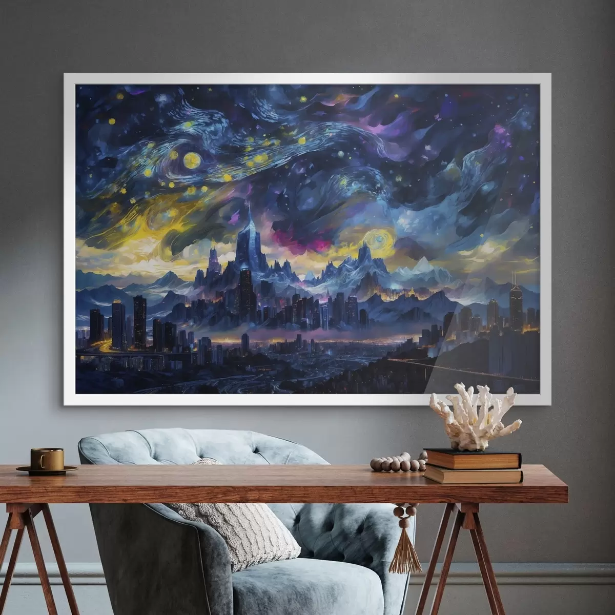 Plakatas Fantazijos miestas po švytinčiu nakties dangumi f47288