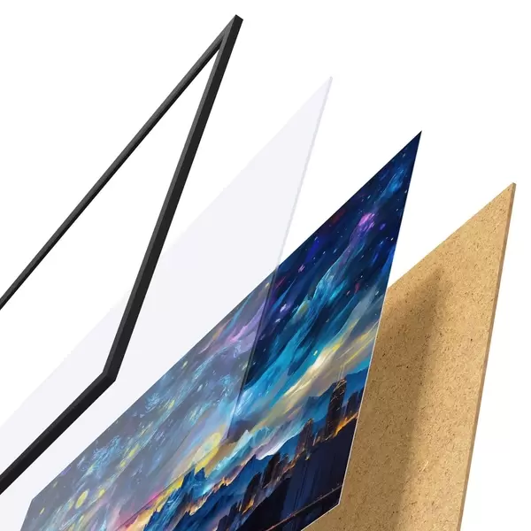 Plakatą sudaro rėmas, pleksiklas, atspausdintas vaizdas ir medžio drožlių plokštės pagrindas. Plakatą galima iš karto pakabinti ant sienos dėl kitoje pusėje esančių laikiklių.
