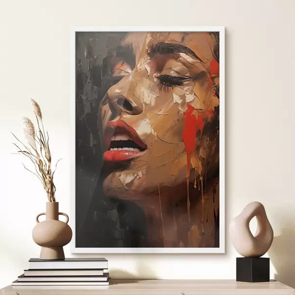 Plakatas Moters portretas šiltais potėpiais ir raudonais atspalviais f47294