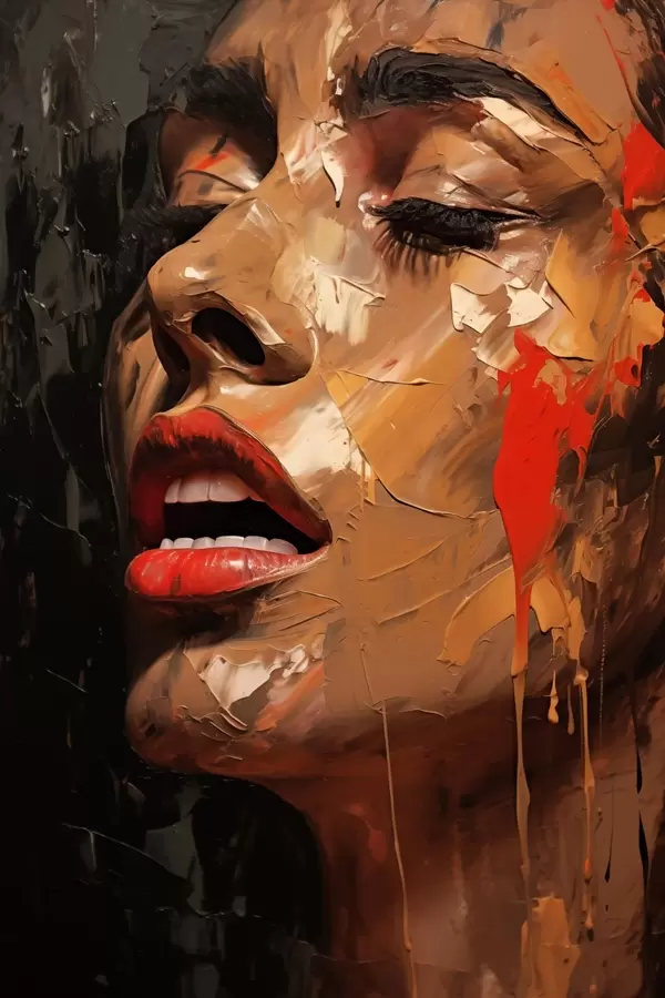 Plakatas Moters portretas šiltais potėpiais ir raudonais atspalviais f47294