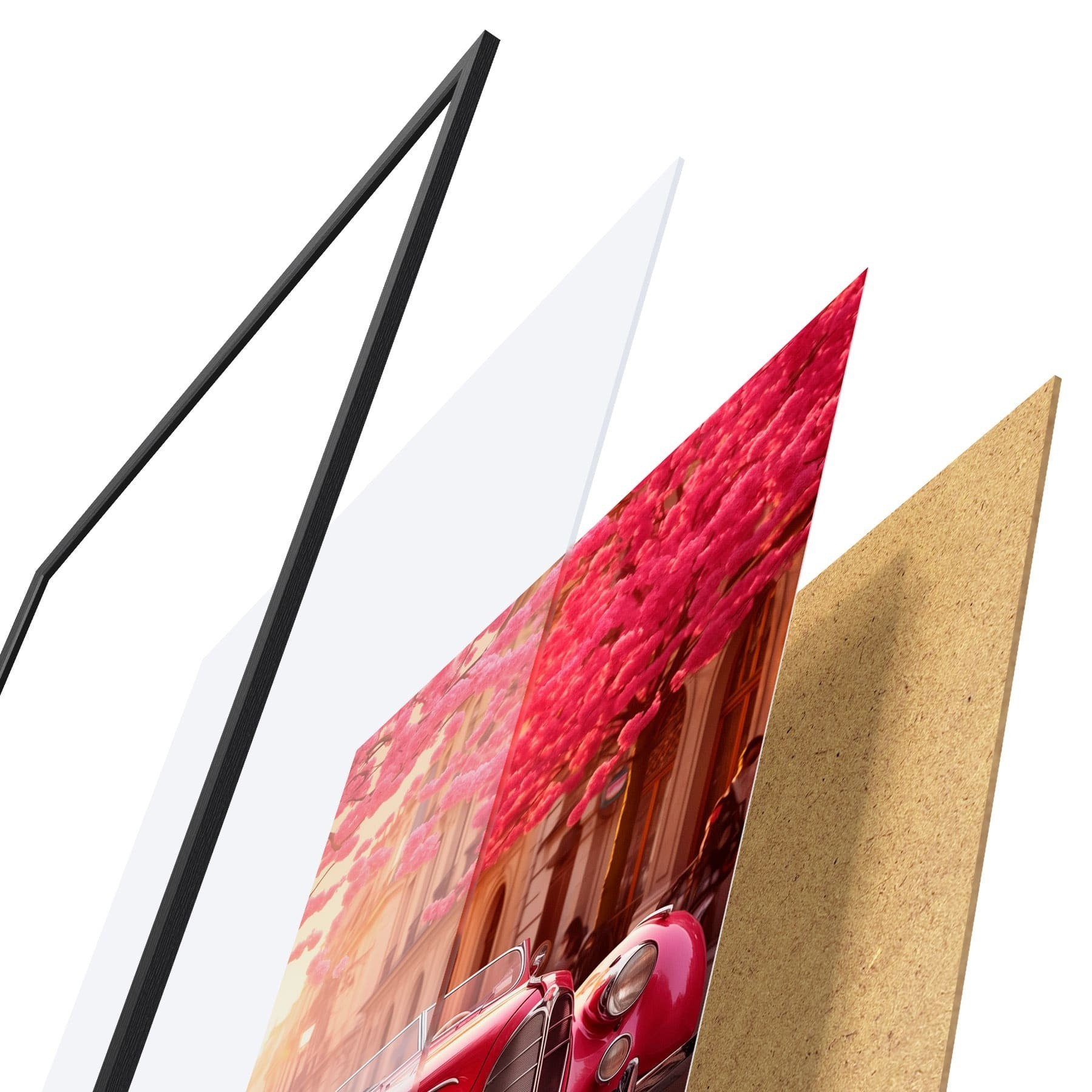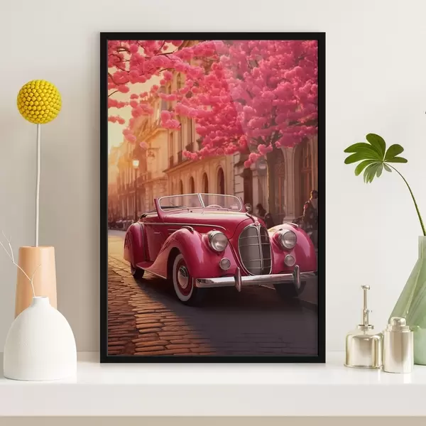 Plakatas Rožinis automobilis po žydinčiais medžiais f47295