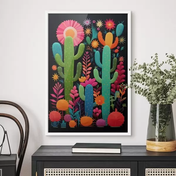Plakatas Ryškūs kaktusai ir gėlės ant tamsaus fono Ne f47297