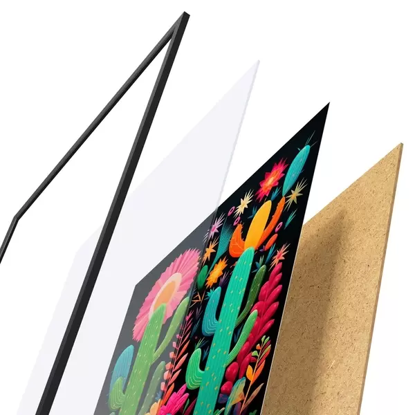 Plakatą sudaro rėmas, pleksiklas, atspausdintas vaizdas ir medžio drožlių plokštės pagrindas. Plakatą galima iš karto pakabinti ant sienos dėl kitoje pusėje esančių laikiklių.