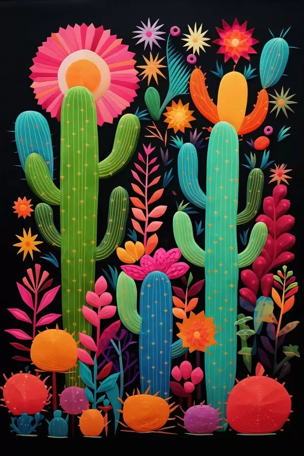 Plakatas Ryškūs kaktusai ir gėlės ant tamsaus fono Ne f47297