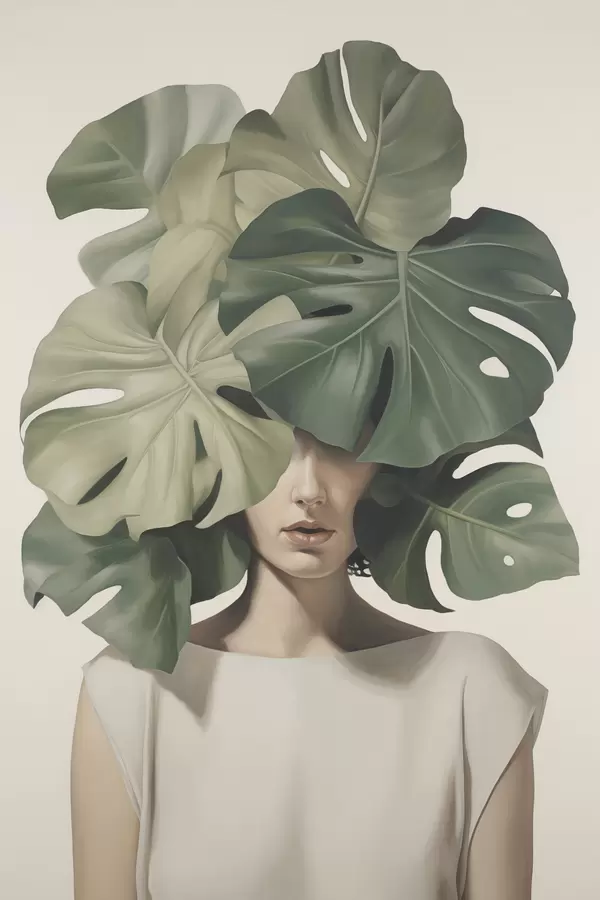 Plakatas Abstraktus merginos portretas su monstera lapais f47336