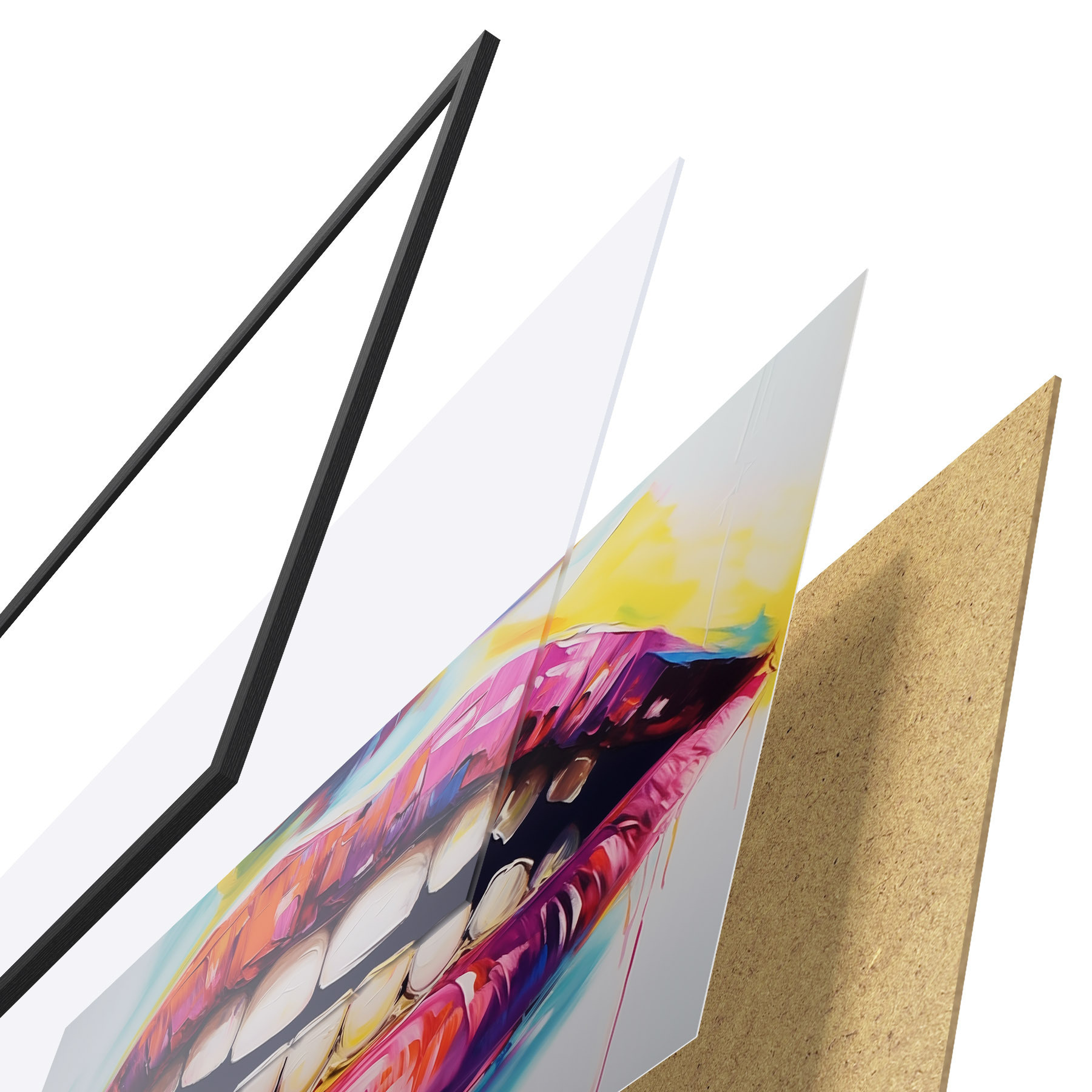 Plakatą sudaro rėmas, pleksiklas, atspausdintas vaizdas ir medžio drožlių plokštės pagrindas. Plakatą galima iš karto pakabinti ant sienos dėl kitoje pusėje esančių laikiklių.