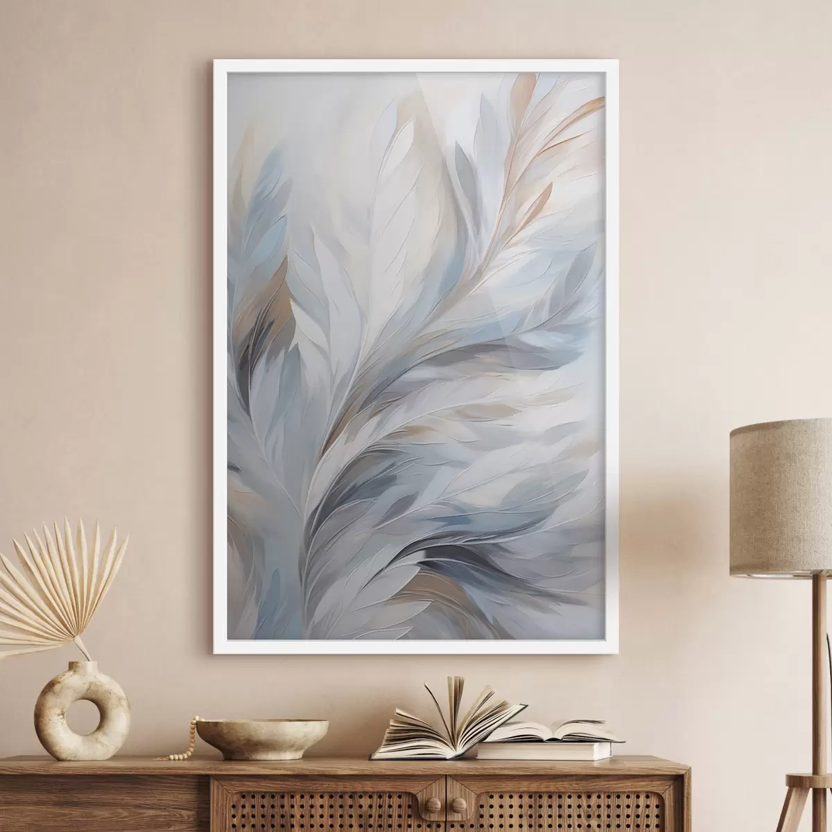 Plakatas Subtilūs šviesiai mėlyni ir rudi plunksnai su švelnia, eterinė tekstūra, ant balto fono f47416