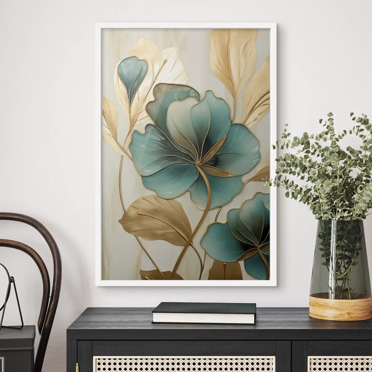 Plakatas Didelės žalios ir geltonos gėlės su kontūrais, apsuptos geltonų lapų ant abstraktaus fono f47419
