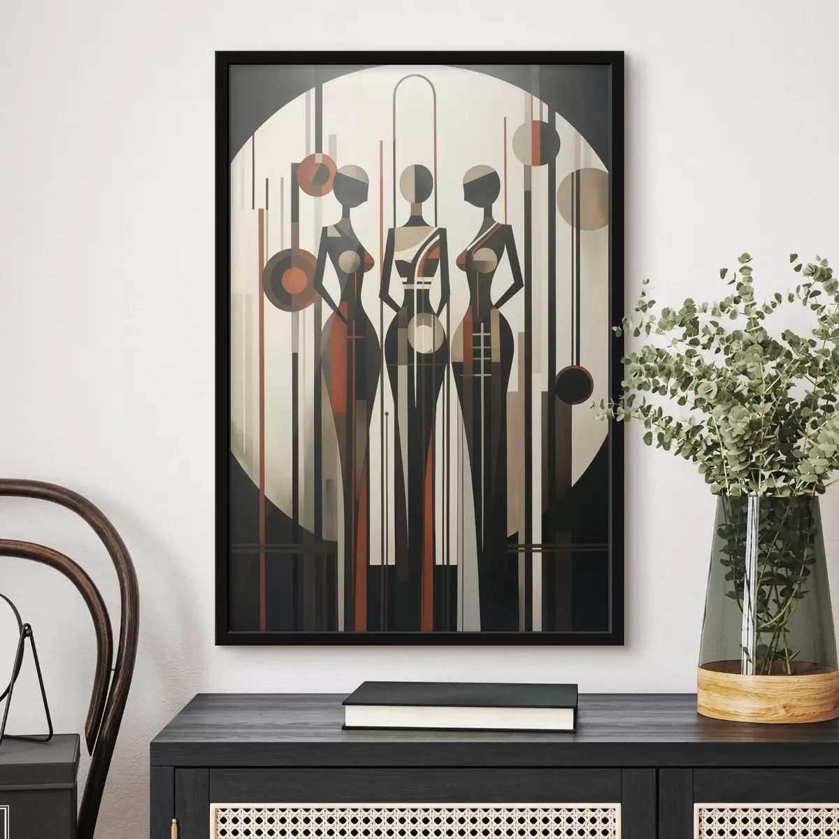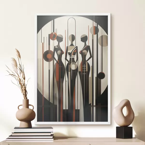 Plakatas Stilizuotos moteriškos figūros su geometriniais elementais ant abstraktaus vertikalių linijų ir apskritimų fono f47422