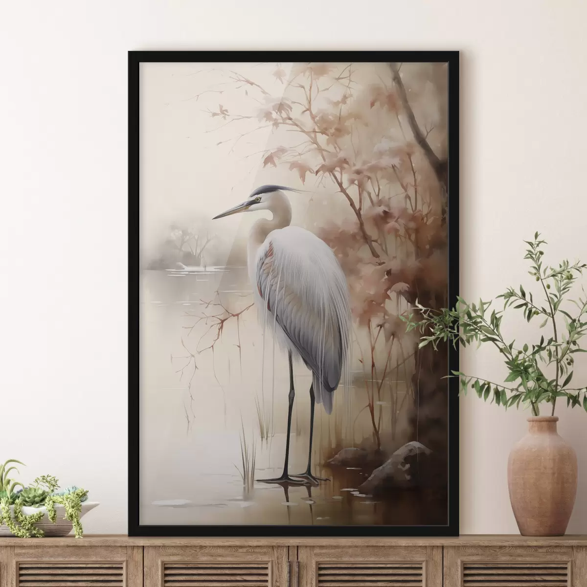 Plakatas Gervė stovi ant uolos ežere, o fone matyti aukšti žolynai ir medžiai. Ne f47427