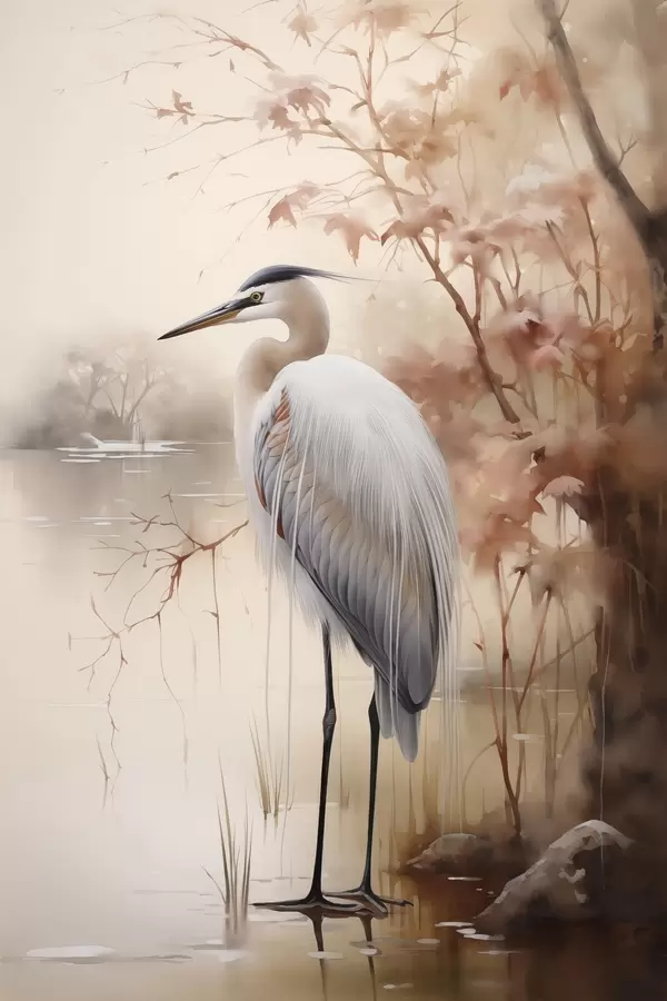 Plakatas Gervė stovi ant uolos ežere, o fone matyti aukšti žolynai ir medžiai. Ne f47427