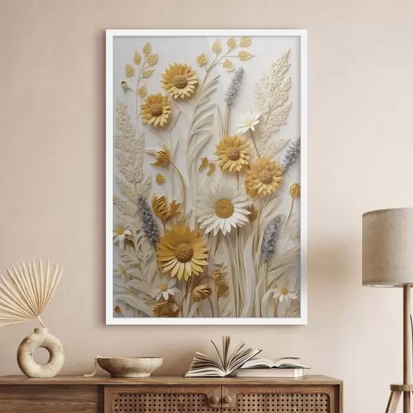Plakatas Tekstūruota geltonų ir baltų saulėgrąžų kompozicija su džiovintomis žolėmis ir levandų šakelėmis ant balto fono. Ne f47430