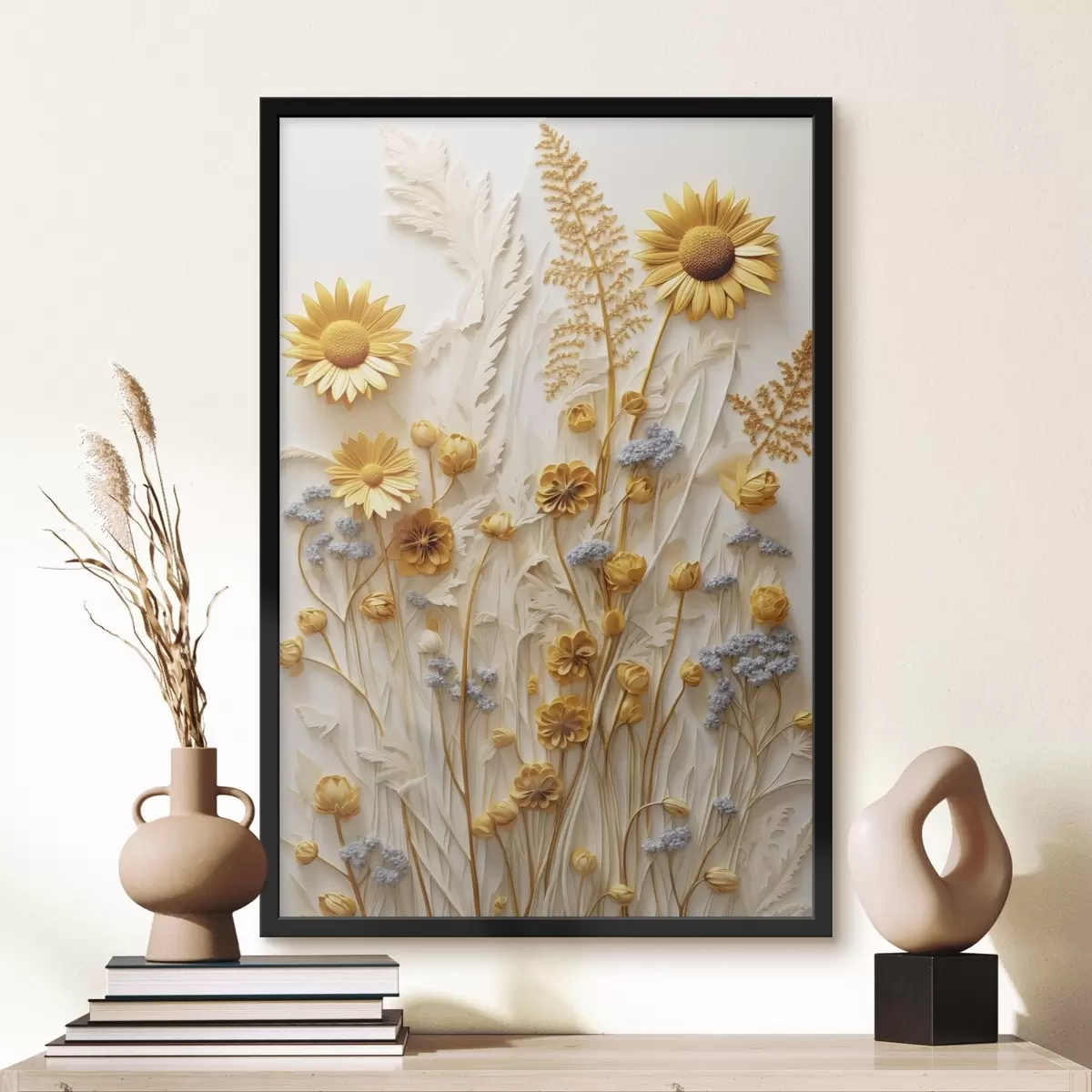 Plakatas Tekstūruota geltonų ir baltų saulėgrąžų kompozicija su džiovintomis žolėmis ir levandų šakelėmis ant balto fono. f47431