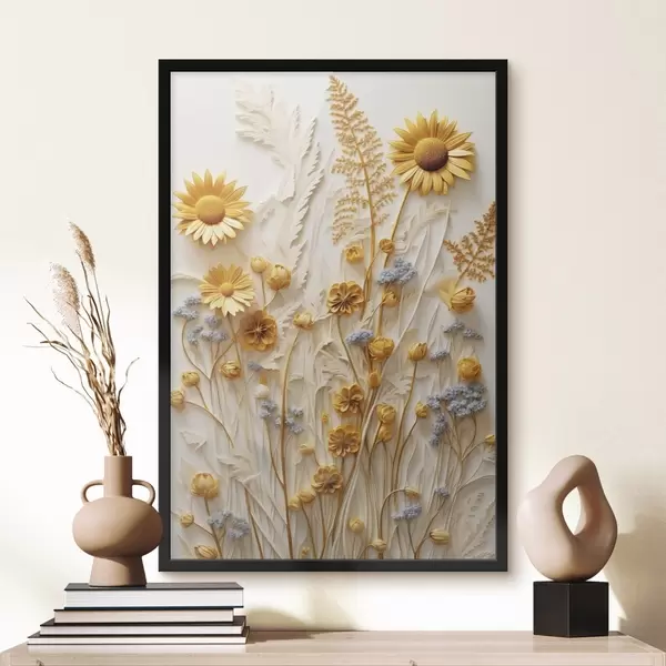 Plakatas Tekstūruota geltonų ir baltų saulėgrąžų kompozicija su džiovintomis žolėmis ir levandų šakelėmis ant balto fono. Ne f47431
