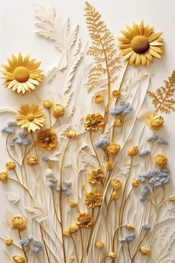 Plakatas Tekstūruota geltonų ir baltų saulėgrąžų kompozicija su džiovintomis žolėmis ir levandų šakelėmis ant balto fono. Ne f47431