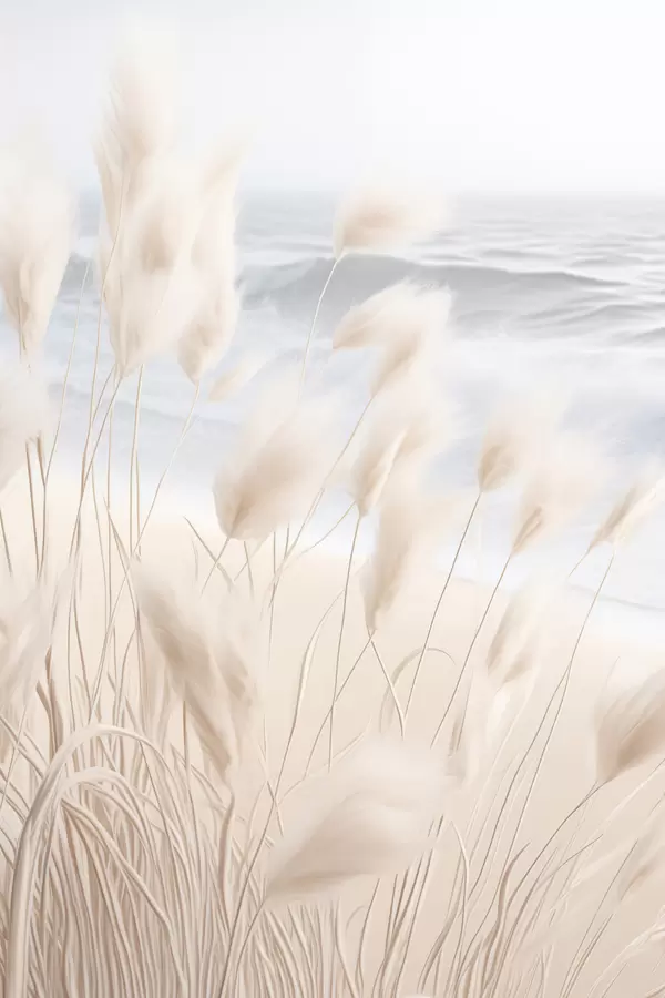 Plakatas Aukšta, plunksniška pampų žolė švelnių smėlio atspalvių pirmame plane, o fone – smėlio paplūdimys. f47432