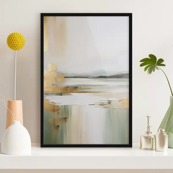 Plakatas Abstraktus peizažas su geltonais ir žaliais atspalviais, vanduo, atspindintis dangų ir tolimus kalnus, blyškus, miglotas dangus Ne f47438