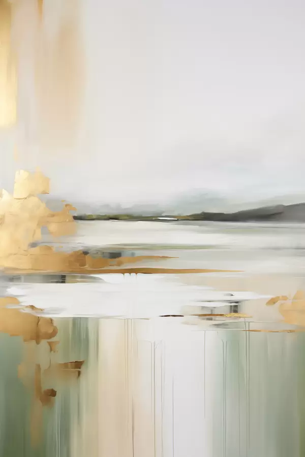 Plakatas Abstraktus peizažas su geltonais ir žaliais atspalviais, vanduo, atspindintis dangų ir tolimus kalnus, blyškus, miglotas dangus f47438