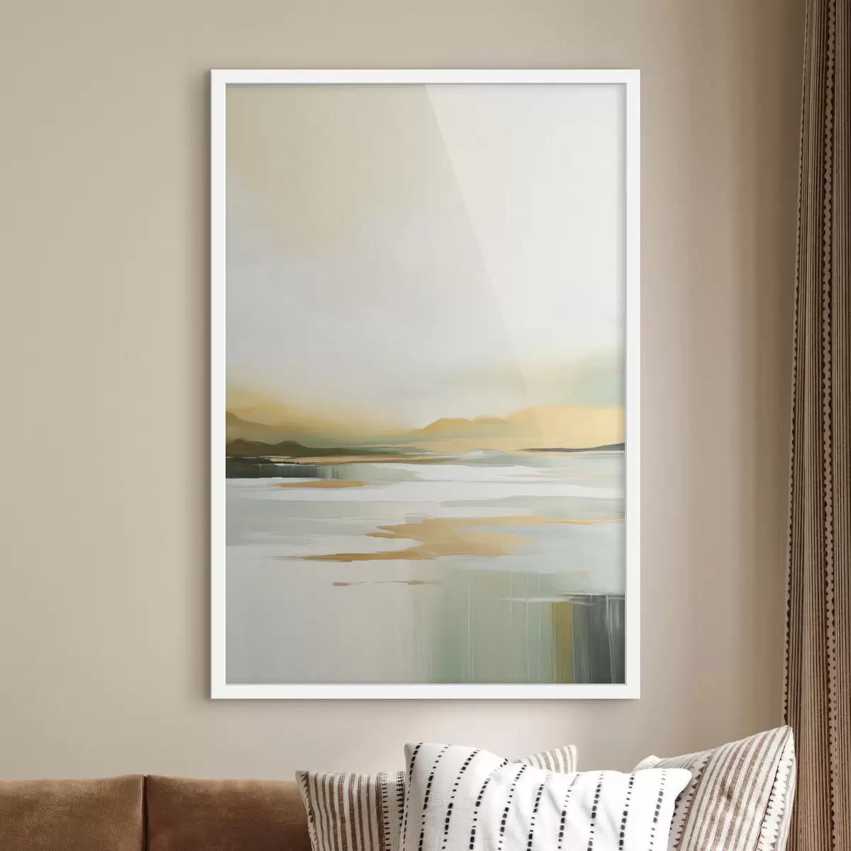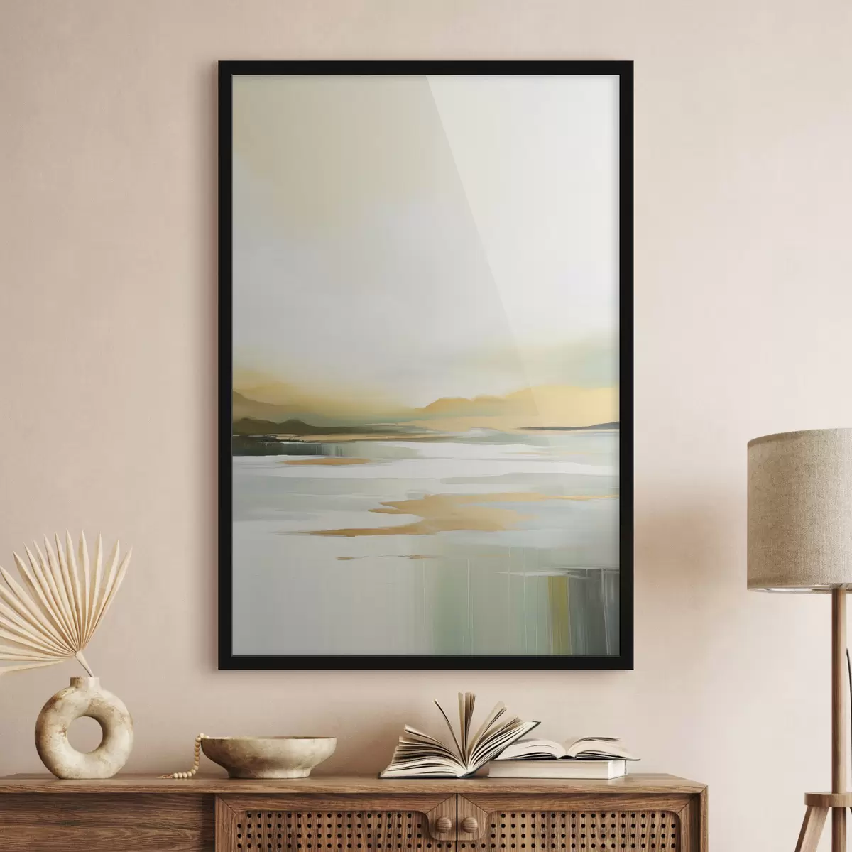 Plakatas Abstraktus peizažas su geltonais ir žaliais atspalviais, vanduo, atspindintis dangų ir tolimus kalnus, blyškus, miglotas dangus f47439