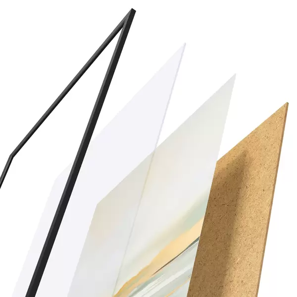 Plakatą sudaro rėmas, pleksiklas, atspausdintas vaizdas ir medžio drožlių plokštės pagrindas. Plakatą galima iš karto pakabinti ant sienos dėl kitoje pusėje esančių laikiklių.