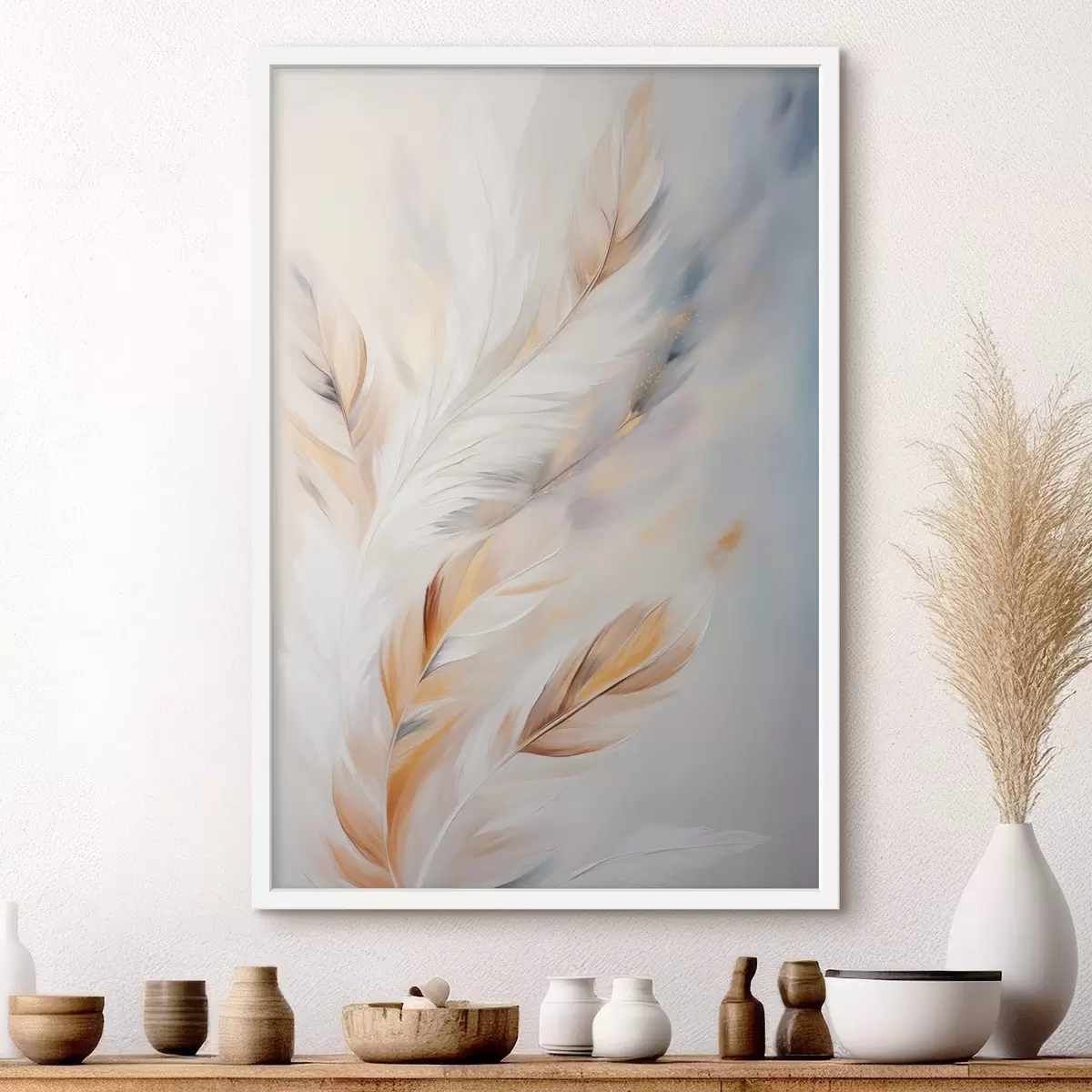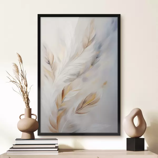 Plakatas Didelės, minkštos plunksnos, kuriose susipina balti, geltoni ir rudi atspalviai, prieš šviesų, abstraktų foną. Ne f47443