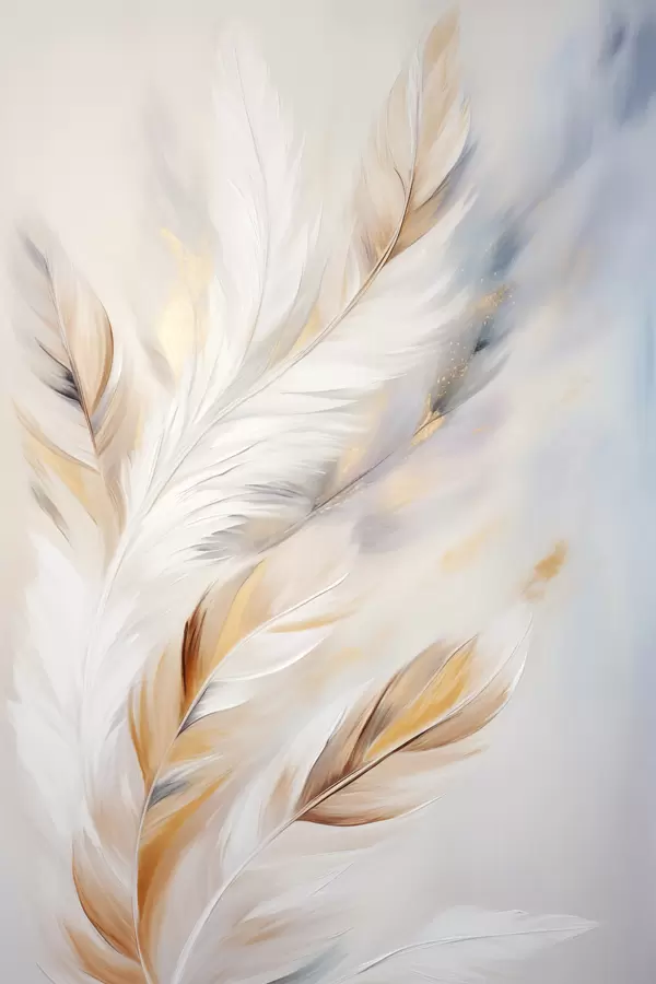 Plakatas Didelės, minkštos plunksnos, kuriose susipina balti, geltoni ir rudi atspalviai, prieš šviesų, abstraktų foną. Ne f47443