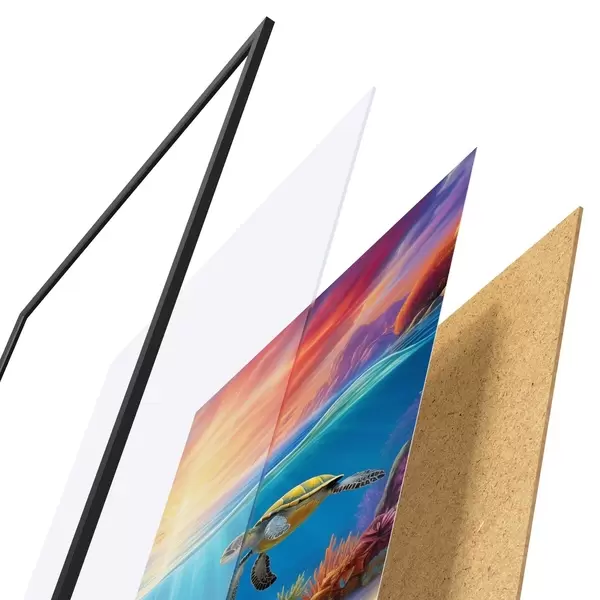 Plakatą sudaro rėmas, pleksiklas, atspausdintas vaizdas ir medžio drožlių plokštės pagrindas. Plakatą galima iš karto pakabinti ant sienos dėl kitoje pusėje esančių laikiklių.