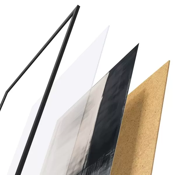 Plakatą sudaro rėmas, pleksiklas, atspausdintas vaizdas ir medžio drožlių plokštės pagrindas. Plakatą galima iš karto pakabinti ant sienos dėl kitoje pusėje esančių laikiklių.