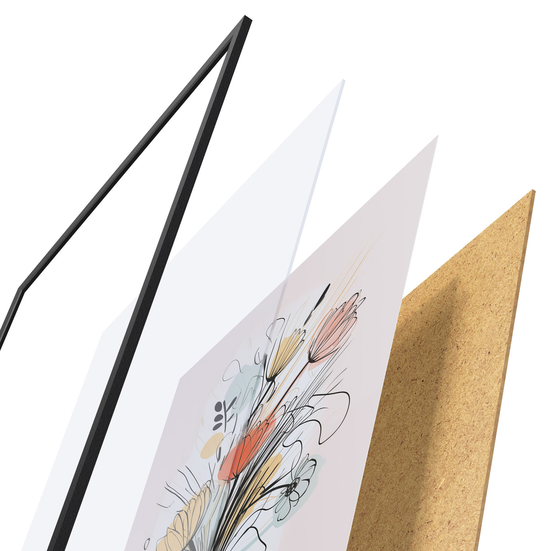 Plakatą sudaro rėmas, pleksiklas, atspausdintas vaizdas ir medžio drožlių plokštės pagrindas. Plakatą galima iš karto pakabinti ant sienos dėl kitoje pusėje esančių laikiklių.
