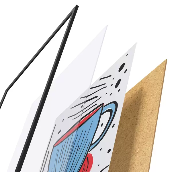 Plakatą sudaro rėmas, pleksiklas, atspausdintas vaizdas ir medžio drožlių plokštės pagrindas. Plakatą galima iš karto pakabinti ant sienos dėl kitoje pusėje esančių laikiklių.