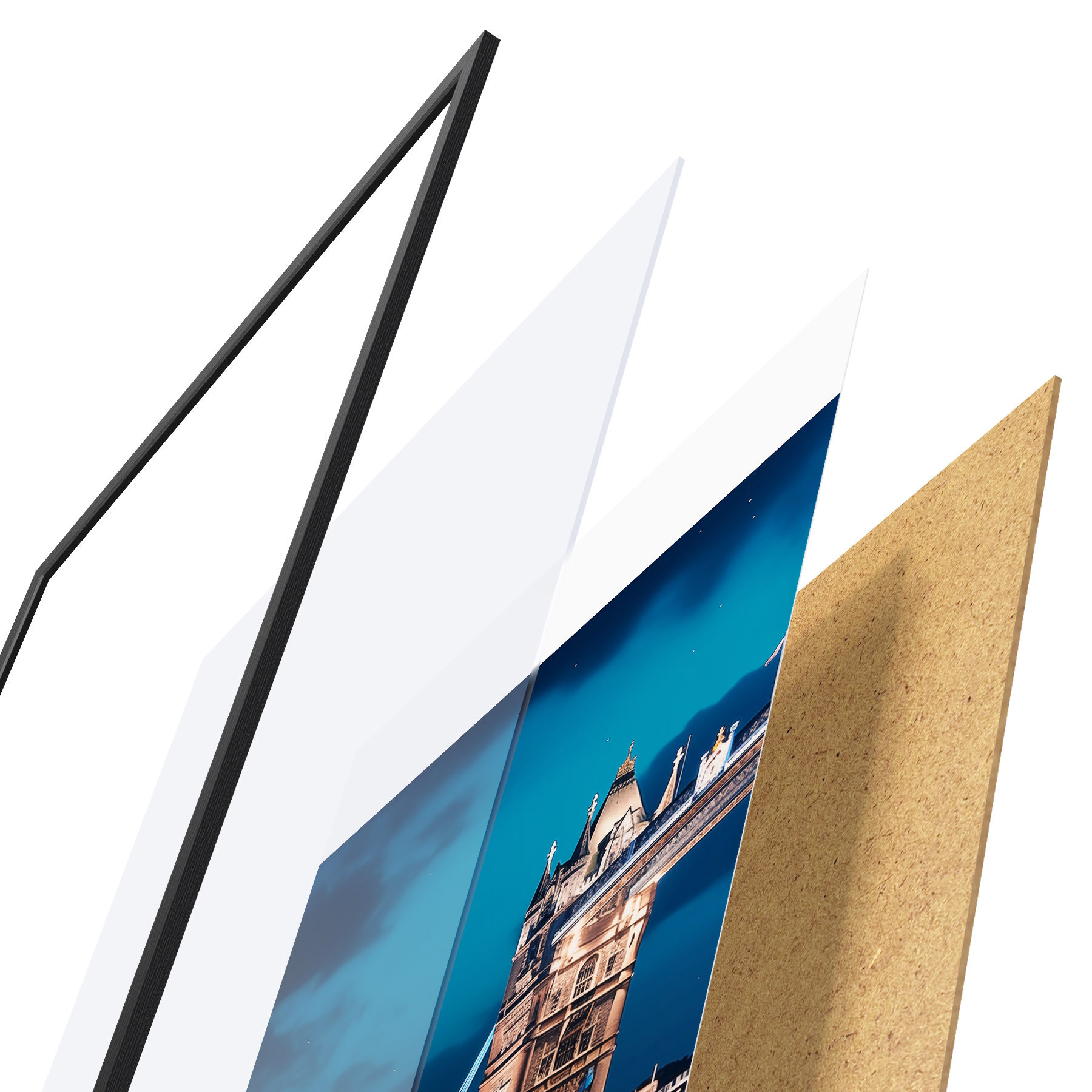 Plakatą sudaro rėmas, pleksiklas, atspausdintas vaizdas ir medžio drožlių plokštės pagrindas. Plakatą galima iš karto pakabinti ant sienos dėl kitoje pusėje esančių laikiklių.